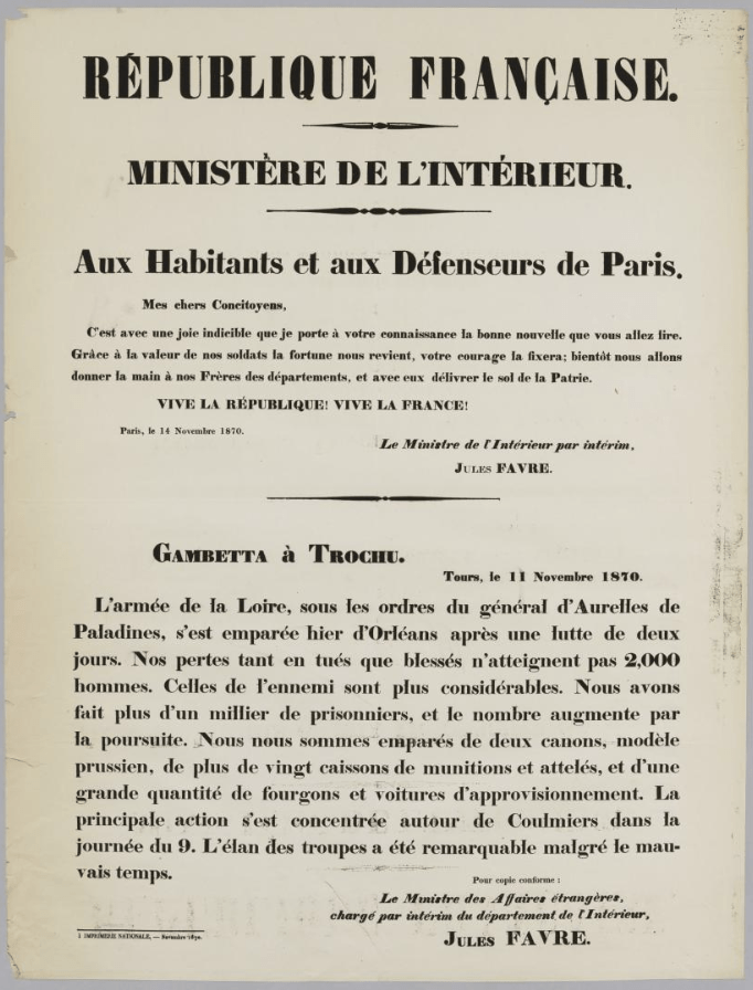 La guerre continue. L’affiche que j’ai utilisée en couverture (et que j’ai trouvée au musée Carnavalet), si elle reproduit une dépêche envoyée par Gambetta de Tours le 11 novembre, n’a été affichée dans Paris que trois jours plus tard, le 14 novembre. Il n’y a guère, dans Paris, que des bruits, à propos d’Orléans, plus des rumeurs de négociations…