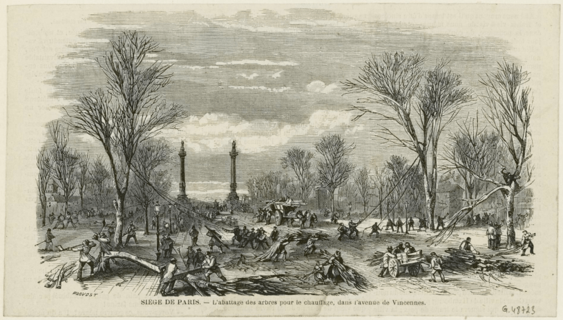 L’hiver, il faut du bois pour se chauffer. C’est ce que tout le monde sait, le suisse de M. de la Palisse le savait, Jules Ferry l’ignore. Vous verrez le dernier commandant de place forte assiégée s’assurer qu’il y a des provisions de bois en suffisance dans toutes les caves; s’il n’y en a pas assez, faire couper du bois vert, et le mettre sécher. Les froids arrivent, Paris tout entier grelotte, M. Jules Ferry, prend sa bonne plume. Ce jour-là il a marché sur un poète, sur un Legouvé quelconque, il est d’un lyrisme effréné. Il annonce aux Parisiens « que les dures nécessités de la guerre l’obligent à un cruel sacrifice. Cette couronne d’ombrages et de verdure qui fait le charme et la joie des environs de Paris, il va l’abattre. Il va l’abattre, avec discernement, sur une grande échelle ». On ne pouvait plus poétiquement parler de bûches.