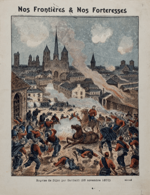 Et, ce même jour… Garibaldi reprenait Dijon. L’image est plus tardive et vient du musée national de l’éducation (c’est une couverture de cahier), et précisément de là.