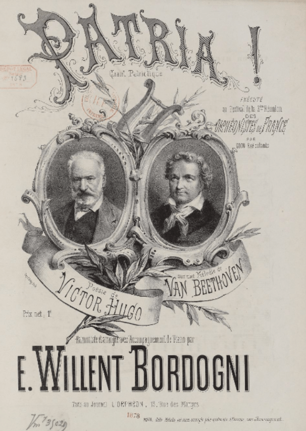 Ce n’était pas du Beethoven, mais peut-être Victor Hugo croyait-il vraiment que c’en était? La partition (un arrangement pour piano) avec cette belle image de couverture est anachronique, elle date de 1878. Mais je n’ai pas su résister à cette image quand je l’ai vue sur Gallica, et donc la voici en couverture.