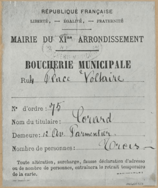 La carte de boucherie, pas du même modèle que celle que décrit notre journaliste, est au musée Carnavalet, là.