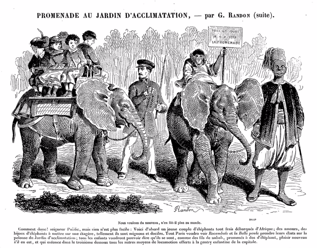 En cliquant sur l’image pour la grossir, vous découvrirez aussi les noms de nos deux héros, la Belle Poule et Rocambole. Au fait, souvenons-nous que, on nous l’a dit, c’étaient un éléphant et une éléphante. Le directeur du Jardin d’Acclimatation