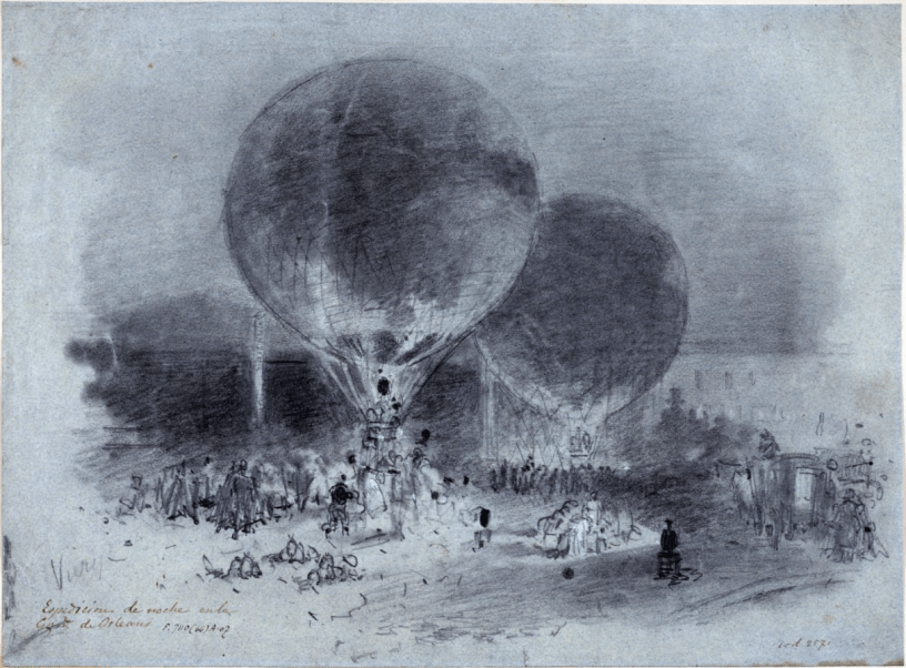 La gare « d’Orléans » (« notre » gare d’Austerlitz) a été pendant le siège un lieu de fabrication et d’envoi de ballons — on n’y prenait pas le train. Datée de janvier 1871, mais certainement d’avant la capitulation, l’estampe de Daniel Vierge que j’ai utilisée ici comme couverture est au musée Carnavalet.