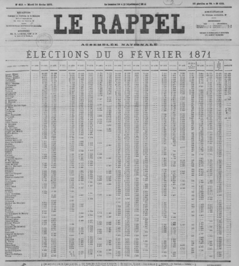 Aujourd’hui, nous lisons Le Rappel. Celui daté de demain 14 février. La une du journal est assez curieuse, c’est un grand tableau à double entrée. Les vingt-deux colonnes sont les vingt arrondissements de Paris plus une pour les communes de banlieue (du département de la Seine) et la dernière pour le total. Les cent lignes sont celles de cent candidats.