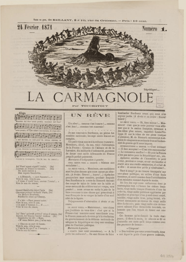 La Carmagnole est un « journal éphémère », que j’avais raté dans « ma » liste de journaux — mais je l’y ajoute en écrivant cet article — et pourtant, il a bien une notice dans le Dictionnaire de la Commune de Bernard Noël.