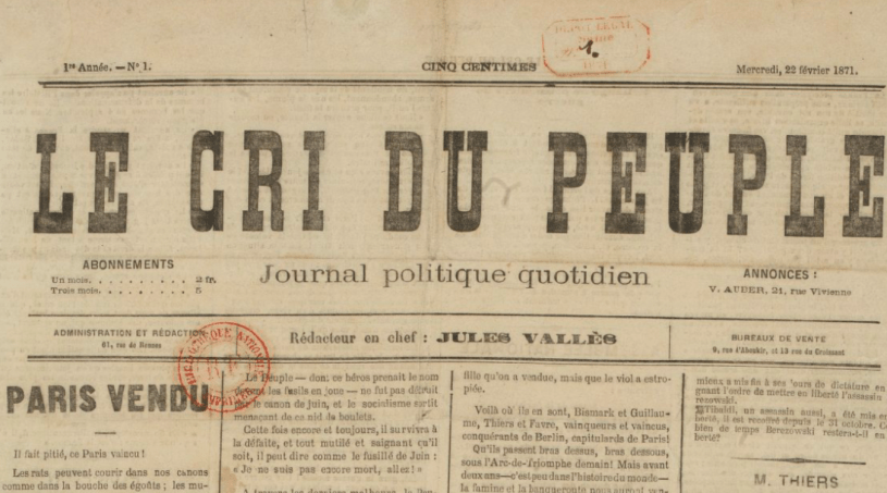 Mais, trêve de bavardage, voici — enfin! — un nouveau journal et dans celui-ci un article de Vallès, un vrai, un beau! Le Cri du Peuple daté du 22 février, en rouge, pour fêter ça!