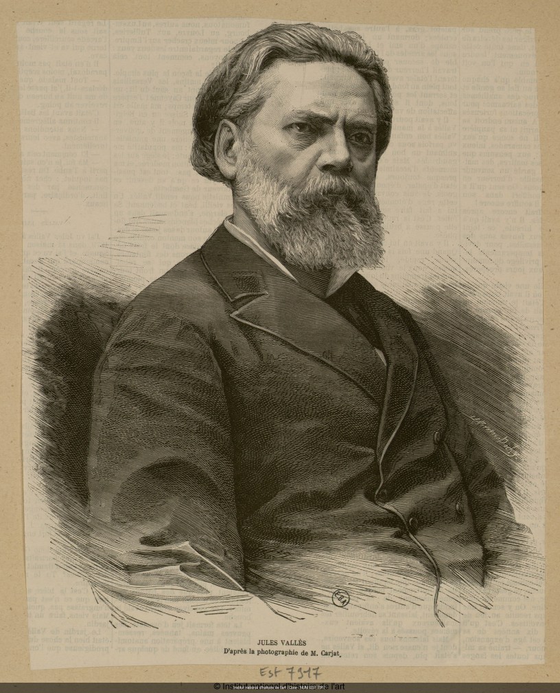 La gravure, signée par Leriverend et Dochy, est une reproduction d’une photographie de Jules Vallès par Étienne Carjat, probablement plus tardive, je l’ai copiée sur le site de l’Institut national d’histoire de l’art (INHA), là.