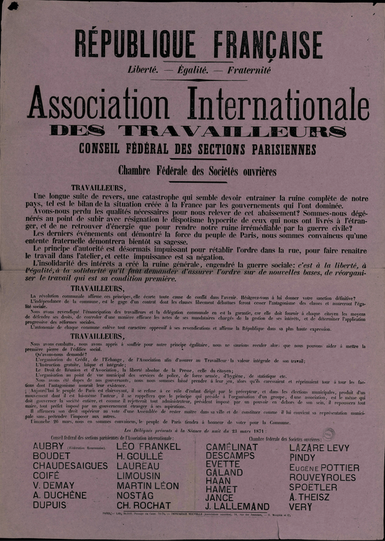 Camélinat, Descamps, Evette, Galand, Haan, Hamet, Jance, J. Lallemand, Lazare Levy, Pindy, Eugène Pottier, Rouveyroles, Spoëtler, A. Theisz, Very
