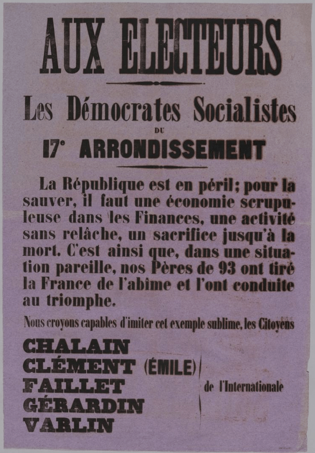 Mais qu’est-ce donc que cette affiche? Il n’y a même pas de date! À y réfléchir quelques secondes, la seule élection possible est bien celle du 26 mars 1871. Le mot « Commune » pourtant n’y est pas! Le fait qu’Eugène Varlin soit membre du comité central de la garde nationale non plus. Autre observation: il manque évidemment, parmi les internationaux du dix-septième arrondissement, le nom de Benoît Malon. Parce qu’il a été élu député? Parce que sa présence au côté des maires — il était adjoint au dix-septième — pendant les négociations avec le Comité central l’a rendu suspect aux auteurs de l’affiche?