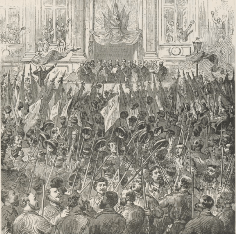 Tout a déjà été écrit sur cette journée de liesse populaire. Moi-même, je lui ai consacré plusieurs chapitres de Comme une rivière bleue, que je vous engage à (re-)lire… Je n’aime pas me répéter, mais heureusement, il y a beaucoup à dire! Je donne la parole, dans l’ordre, à Léopold Boursier, Catulle Mendès en violet (comme hier) dont j’espère que vous apprécierez les qualités, notamment celle de son envoi final, Euphrasie Leblanc, un membre élu de la Commune qui a préféré garder l’anonymat et, tard dans la nuit, déjà demain, à Pierre Denis.