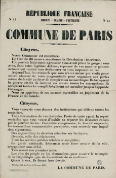 Une commission a été nommée pour la rédaction d’une proclamation (Grousset, Vaillant, Tridon et Protot). Et une proclamation a été rédigée — il s’agit du texte de l’affiche que j’ai utilisée en couverture (et que j’ai trouvée à La Contemporaine). Vous pouvez cliquer sur l’image ci-dessous pour l’agrandir et la lire.