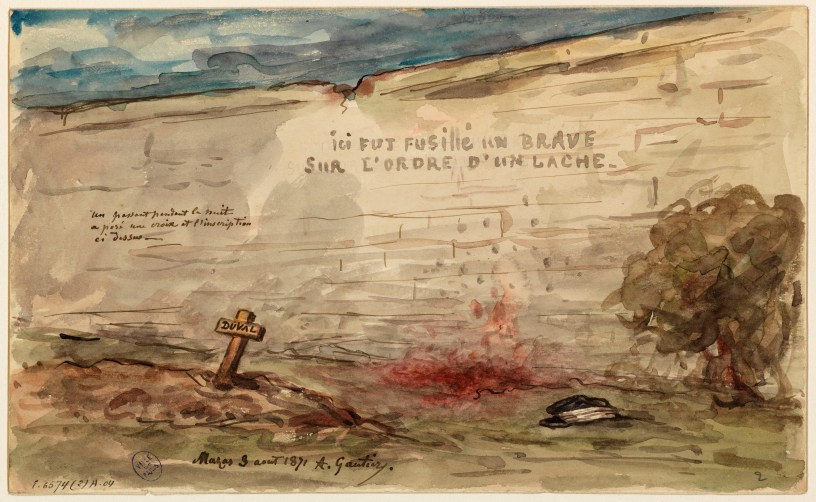 Amand-Désiré Gautier était emprisonné à Mazas, en août 1871, et c’est là qu’il a peint l’aquarelle que j’ai utilisée comme couverture, en hommage à Émile Duval (je ne sais pas ce que celui-ci aurait pensé de la croix) et en souvenir de son assassinat par Vinoy. Elle est aujourd’hui au musée Carnavalet.