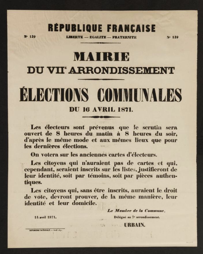 Mais… on ne considère pas non plus nécessairement, en 1871, que ce soit la façon la plus adéquate de s’exprimer en démocratie. Sans plus de bavardage, voici deux communications publiées par le Journal officiel le 14 avril, en préparation du scrutin d’aujourd’hui: