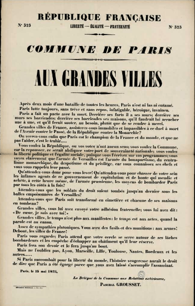 Ce même numéro du Journal officiel contient aussi (en première page) le texte de l’affiche « Aux grandes villes », datée du 15 mai, que j’ai utilisée en couverture de cet article (et que j’ai copiée à La Contemporaine), signé du délégué aux relations extérieures, Paschal Grousset.