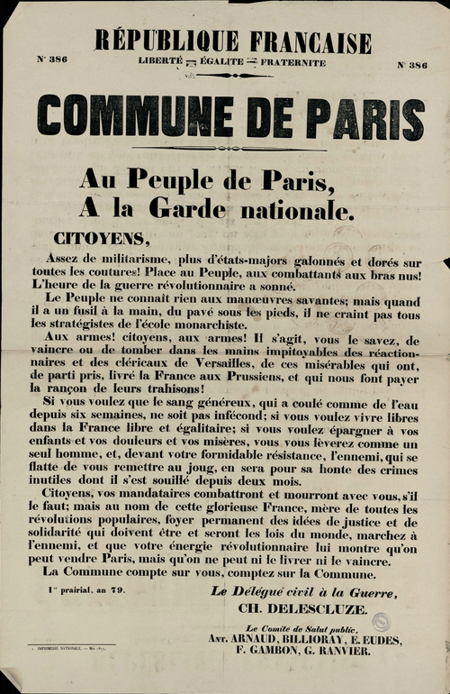 Remarquez que cette proclamation du Comité de Salut public ne contient pas explicitement le fait que l’armée versaillaise est entrée dans Paris — mais elle l’est (voir notre article d’hier). Remarquez aussi, comme dit Lissagaray, qu’elle « flétrit » la discipline — alors même que l’absence de discipline était le gros point faible de la garde nationale.