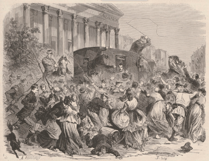 C’est dans la mairie que Paschal Grousset a changé ses vêtements de femme pour reprendre le costume de son sexe. Puis il a été mis dans une voiture et dirigé sur Versailles. Le bruit de son arrestation s’étant répandu, on a eu toutes les peines du monde à préserver la voiture qui l’emporta des agressions de la foule. C’est surtout en passant dans la rue Royale, devant les ruines des maisons incendiées, que des cris de mort retenti: