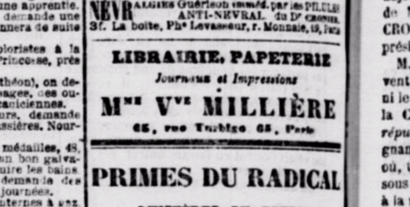 Louise Millière tient une librairie papeterie 65 rue de Turbigo. Elle y vend des journaux. Un encart publicitaire que publie régulièrement Le Radical et qui sert de couverture à cet article en témoigne. Aucune chance qu’elle rate les lettres publiées dans Le Figaro d’hier (et dans notre article précédent), d’autant plus que d’autres journaux les reprennent. Elle écrit aussitôt une réponse (je la cite en vert):