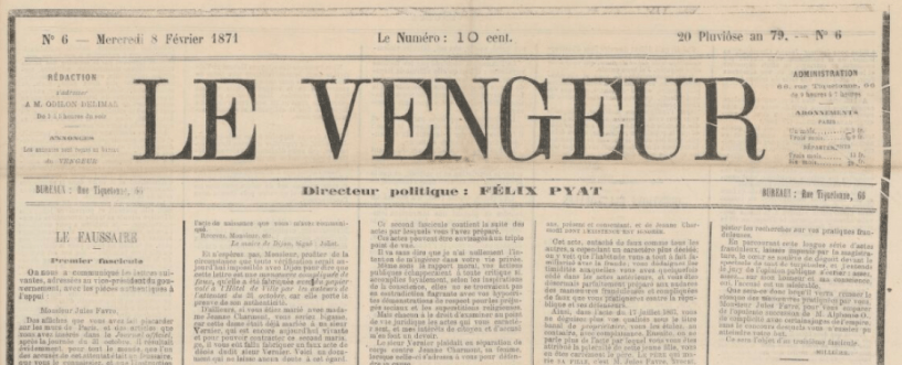 Je vous passe la suite. Les déclarants sont un gendre et un neveu de Jeanne Charmont. Jules Favre n’apparaît pas sur cet acte. Ce qui explique peut-être que ce soit le premier acte sans mensonge que nous voyons… À part cet acte, toutes les informations contenues dans cet article viennent tout droit du Vengeur daté du 8 février 1871. Et la couverture aussi!