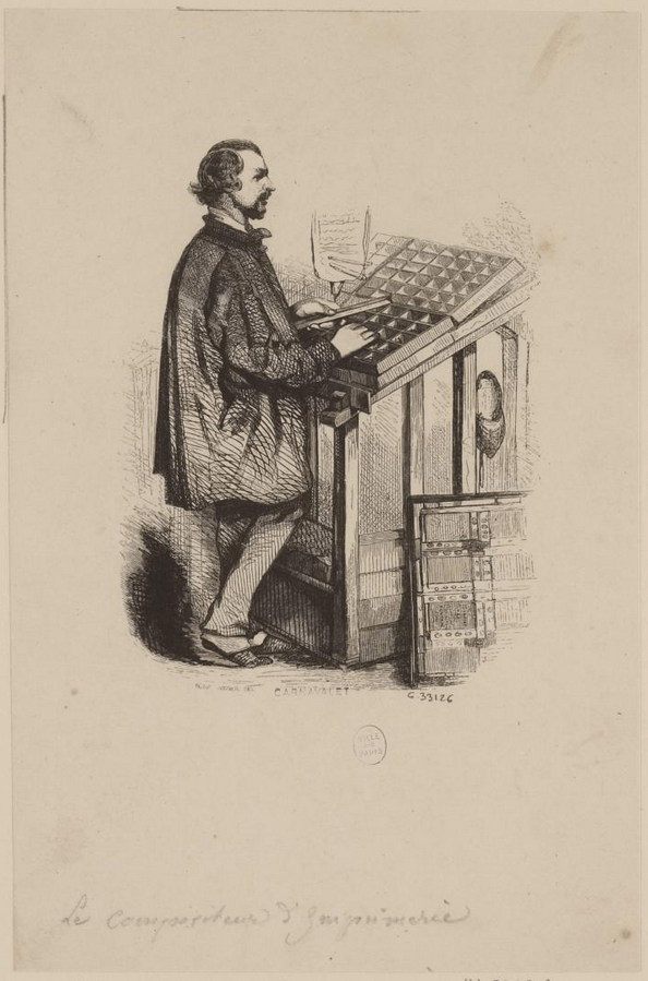 Le typographe (compositeur d’imprimerie) a été dessiné par Henry Bonaventure Monnier, je l’ai trouvé au musée Carnavalet.