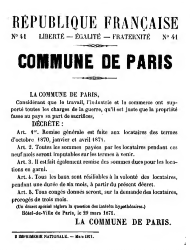 Élue le 26 mars, la Commune est proclamée le 28, se réunit une première fois le soir-même et deux fois le lendemain. C’est au cours de la deuxième séance du 29 mars que le décret sur les loyers a été voté. C’est très exactement le deuxième décret de la Commune (le premier abolit la conscription). Vous pouvez le lire sur l’affiche qui sert de couverture à cet article (et que j’ai déjà utilisée là). Je passe la parole à Arthur Arnould, qui raconte: