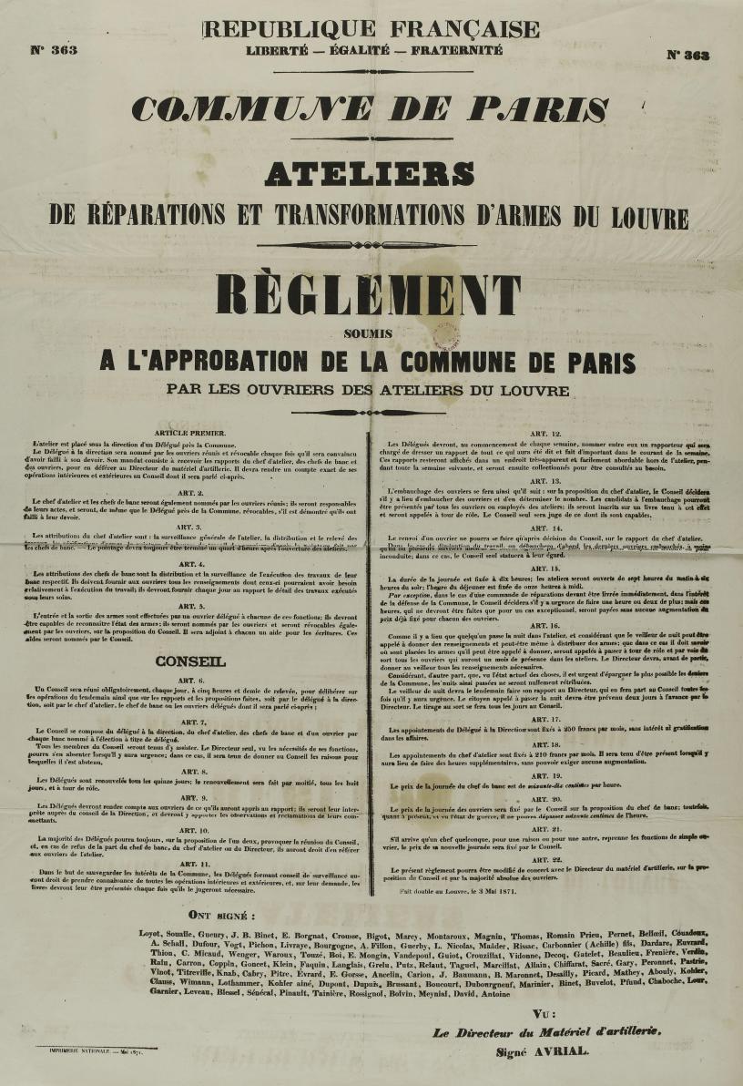 Par exception, dans le cas d’une commande de réparation devant être livrée immédiatement, dans l’intérêt de la défense de la Commune, le Conseil décidera s’il y a urgence de faire une heure ou deux de plus; mais ces heures, qui ne devront être faites que pour un cas exceptionnel, seront payées sans aucune augmentation du prix déjà fixé pour chacun des ouvriers.