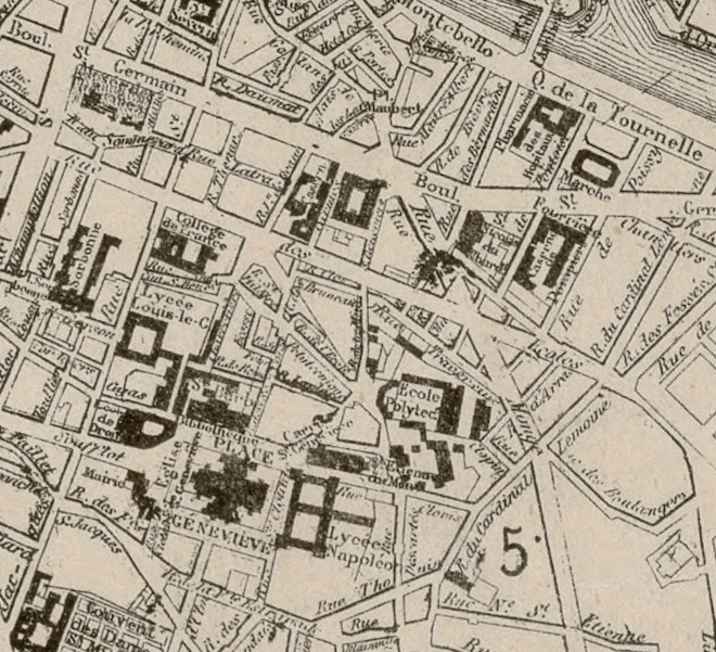 Marie part à la recherche de son mari. Rue Clovis, place du Panthéon, bibliothèque Sainte-Geneviève, son regard fouillant les tas de corps fusillés, devant la mairie, les portes cochères de la rue Soufflot, la fontaine Médicis, elle rentre chez elle par la rue de la Montagne-Sainte-Geneviève. Voir le plan ci-dessus, extrait de toujours le même plan de Paris…