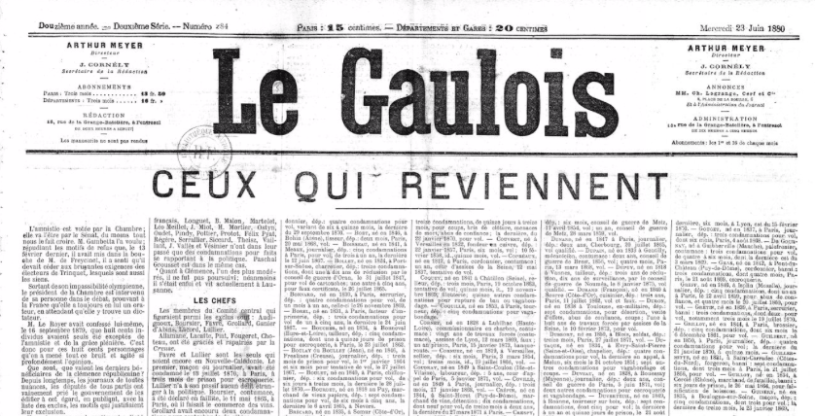 Encore une infamie. Après le vote de l’amnistie plénière par l’Assemblée nationale, le quotidien Le Gaulois a publié, sur toute la une de son édition du 23 juin 1880 et sur une grande partie de la page 2, sous le titre « Ceux qui reviennent » (notre image de couverture), une immense liste de condamnés qui avaient eu précédemment « maille à partir avec la justice », quatre cents dossiers, selon ce journal. Très peu de femmes, mais le tout dernier nom de cette liste alphabétique est :