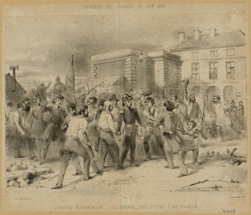Je ne résiste pas à mettre encore ici une image de 1848, qui « raconte » l’histoire du Général Bréa. Elle a dû paraître dans un journal mais je l’ai trouvée au musée Carnavalet.