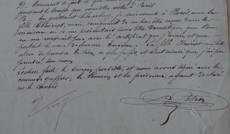 En quittant Charbuy, je suis venue à Paris avec la fille Clairiot, mais, craignant de ne pas être reçue dans las maisons où je me présentais pour être domestique, que l’on ne me recevrait pas avec le certificat que j’avais, et qui portait le nom de femme Eugène. La fille Clairiot me dit alors de prendre le sien, ce que je fis, et c’est ainsi que j’ai pu prendre son nom.