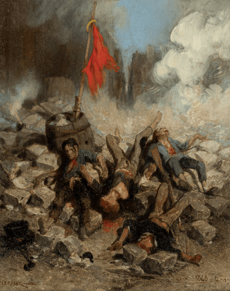 1848. — Le 24 juin 1848, il flotte sur la mairie du huitième (cet arrondissement ancien regroupait le faubourg Saint-Antoine et les quartiers Popincourt, des Quinze-Vingts et du Marais). Sur les barricades, il accompagne souvent les drapeaux tricolores des ateliers nationaux — même s’il est bien rouge sur celles du faubourg Saint-Antoine. Il disparaît des rues de Paris après le massacre des prolétaires qui l’arboraient.
