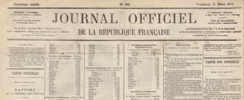 J’ai un tout petit peu anticipé dans l’article précédent. Le 31 mars, le Journal officiel publie à son tour (après Maroteau en novembre et Vallès début mars) un « Le drapeau rouge » que voici.