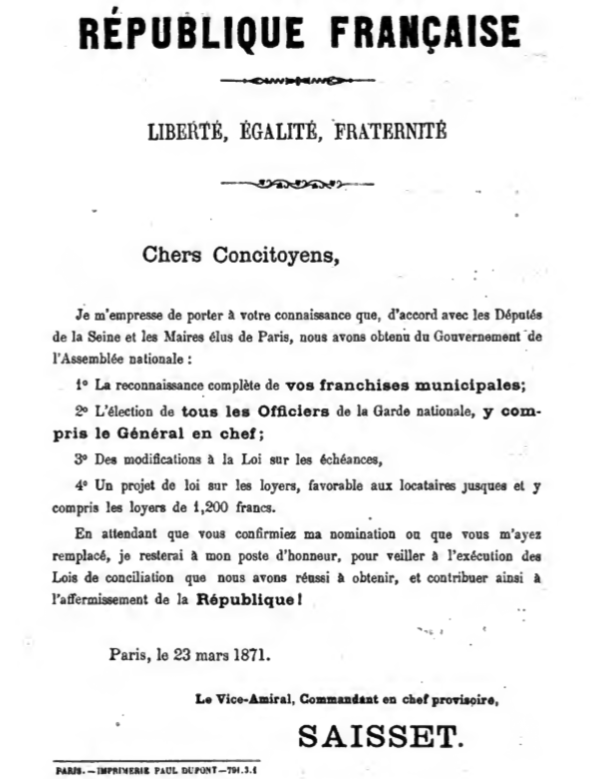 Ce jour-là, 23 mars, la Commune n’est pas encore tout à fait maîtresse de Paris [il n’y a d’ailleurs pas encore vraiment de Commune, l’assemblée communale n’est élue que trois jours plus tard]. Le vice-amiral Saisset, nommé par Versailles commandant en chef provisoire de la Garde nationale, a fait placarder une affiche invitant les Parisiens à rester fidèles au gouvernement, qui reconnaît leurs franchises municipales, admet l’élection des officiers de la Garde et annonce une loi libérale sur les échéances et les loyers; ceci pour tâcher de regrouper les éléments de l’ordre autour de quelques maires qui s’opposent au mouvement déclenché le 18 mars [C’est cette affiche, copiée dans un livre de « murailles », que j’utilise en couverture].