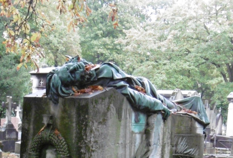 mais je ne me souvenais pas du gisant de Baudin. J’ai eu un peu de mal à le trouver. D’ailleurs, le plan officiel de la ville de Paris indique toute une liste de tombes ou monuments de personnes « célèbres », mais pas Baudin. Je sais bien que les restes de Baudin sont au Panthéon, mais je sais aussi que le gisant est toujours là. Et en plus, il pleuvait de plus en plus fort. Heureusement, il y a un « chemin » Baudin, dans lequel j’ai fini par me frayer un chemin. Et voilà!