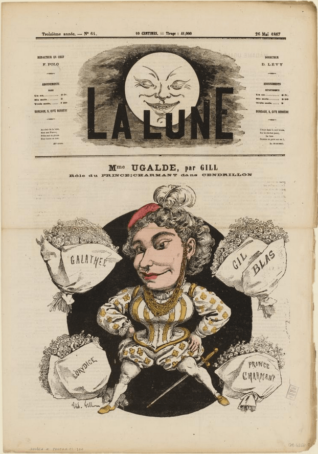 La caricature de Gil représente Delphine Ugalde dans le rôle du Prince charmant, en 1867, dans une « féérie de Clairville, Monnier et Blum » (sur une musique de Victor Chéri) représentée au Châtelet. Je l’ai trouvée sur le site des musées de Paris.