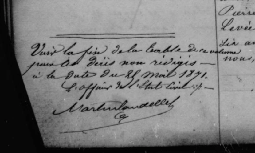 Suite de l’article précédent. Voici donc ce que M. Émile Martin Landelle a écrit dans une marge de la page des décès du 29 mai 1871 — page dont, par ailleurs, il avait bâtonné tous les actes: