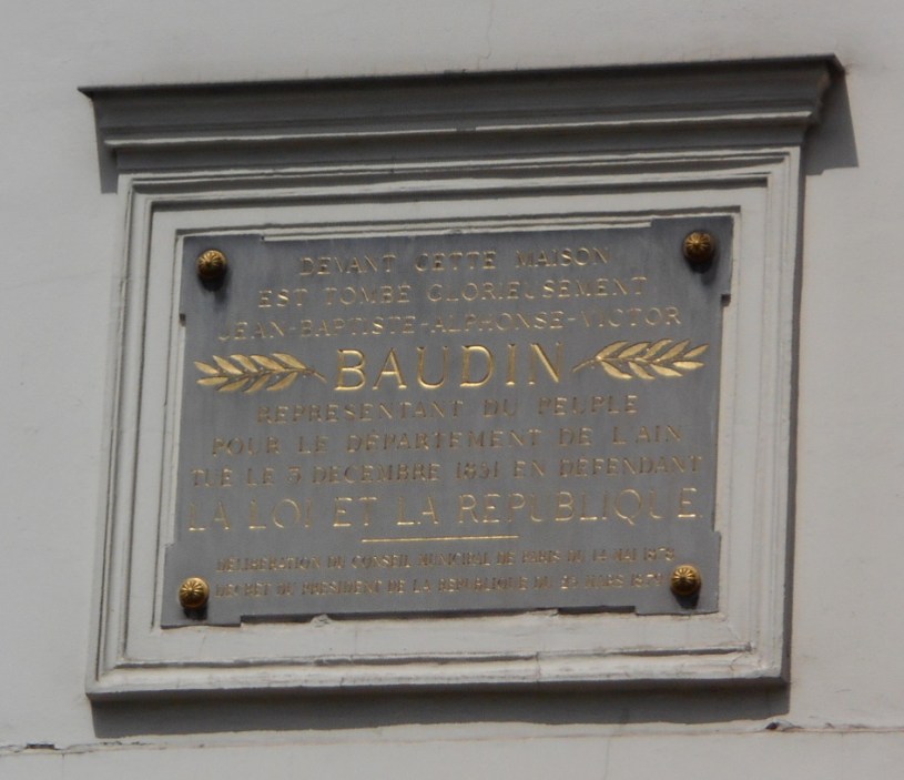 Bien entendu, en 1980, je n’avais jamais entendu parler d’Affre. Pas davantage de Baudin, dont pourtant le nom m’était familier, pas tant parce qu’il contient le mien que parce que j’avais vécu naguère dans une ville comportant un important « boulevard Baudin » — mais j’ignore de quel Baudin ce boulevard portait le nom. Il y avait (et il y a toujours) dans ce qui est devenu mon nouveau quartier, avenue Ledru-Rollin, un « hôtel Baudin », en un lieu que je sais maintenant être un peu impropre. Il y a aussi une plaque, dans un endroit plus approprié, au 151 rue du Faubourg-Saint-Antoine, au coin de la rue Trousseau, mais assez haut, de sorte que je ne l’ai découverte qu’assez récemment (en 2018) et encore, parce qu’un ami me l’avait signalée. J’ai d’ailleurs écrit un article sur les plaques du faubourg sur ce blog, où je l’ai mentionnée j’ai fait la photographie de couverture à cette occasion) — il s’agissait de l’inauguration d’un passage Marie Rogissart.